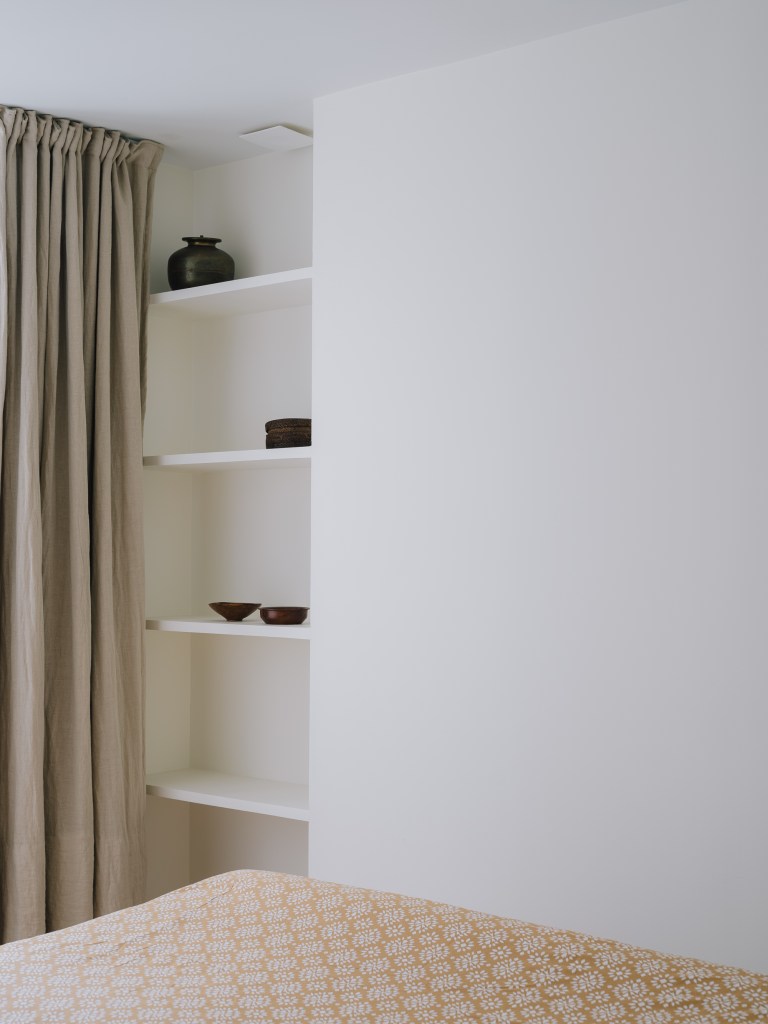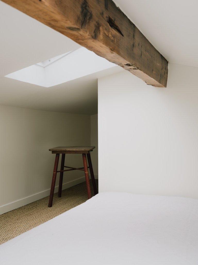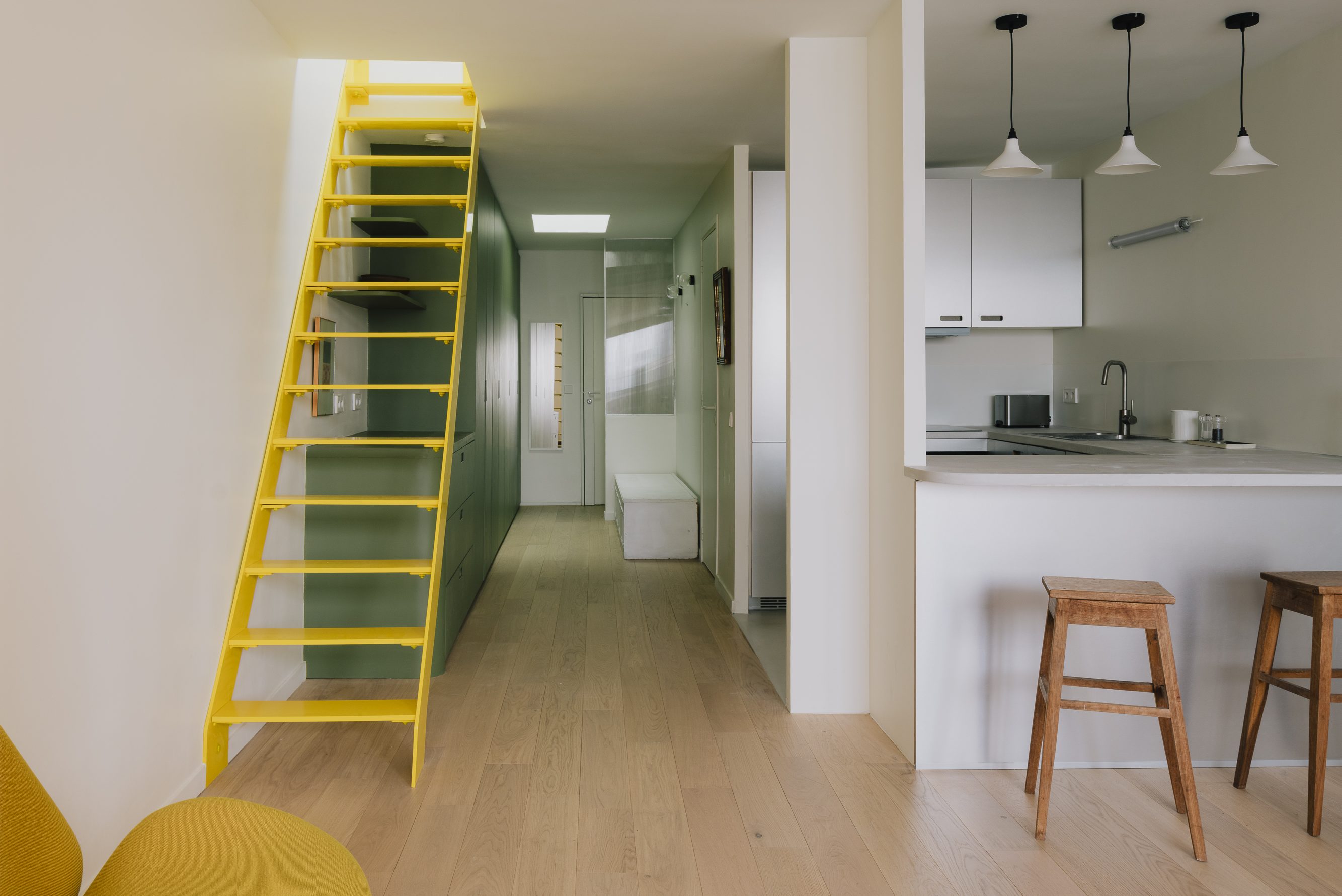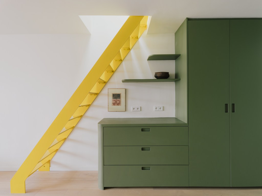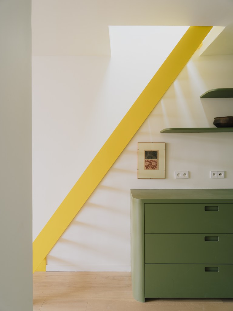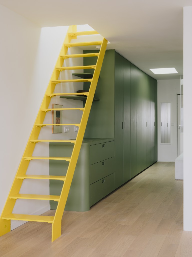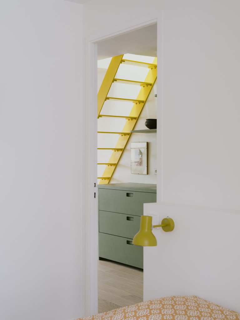 Des touches contemporaines ont également été apportées pour valoriser l’espace. Un escalier sur mesure en métal jaune Colzac constitue désormais une pièce maîtresse visuelle dans la pièce de vie principale, apportant couleur et dynamisme. La cuisine, composée d’éléments en acier inoxydable (Ikea et Cubro), reflète magnifiquement la lumière naturelle. La salle de bain et les combles ont été entièrement repensés afin d’améliorer à la fois le confort et la fonctionnalité.