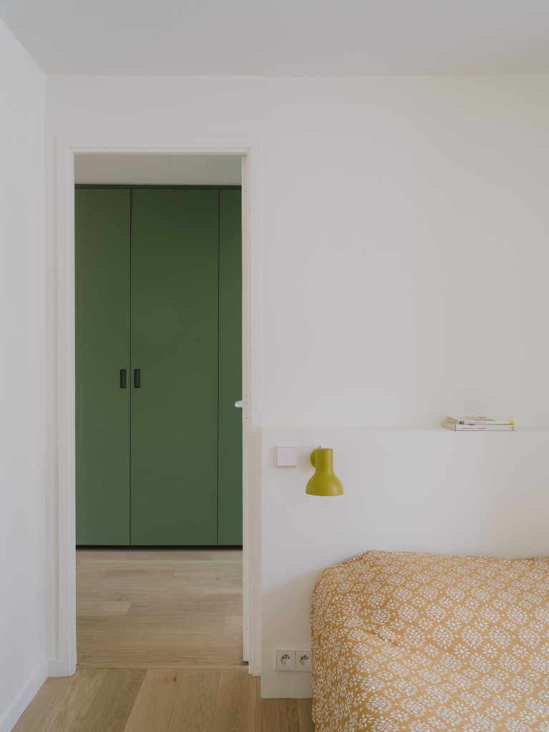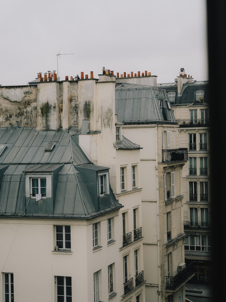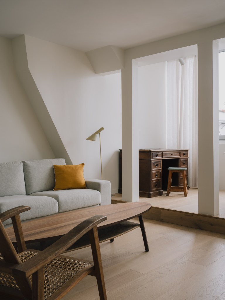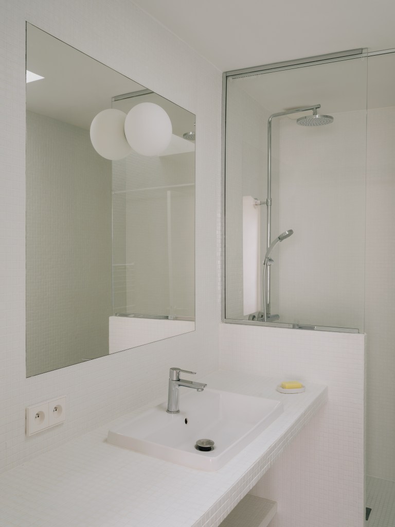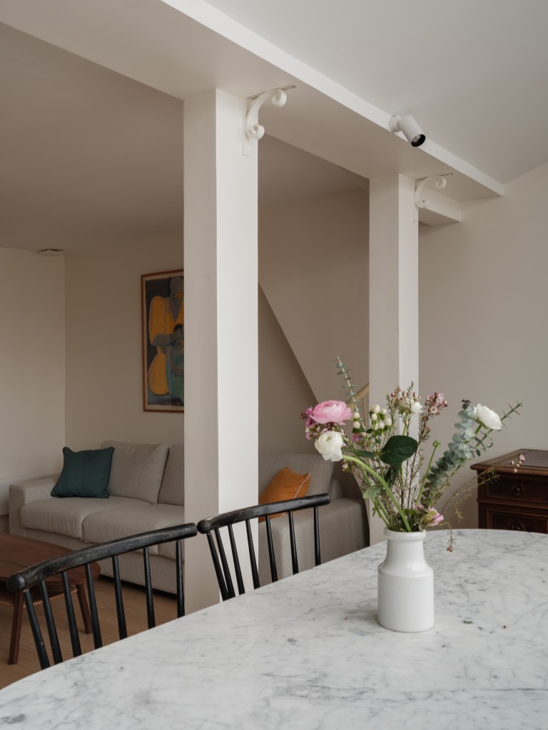 La préservation du caractère de l’appartement a été une préoccupation centrale tout au long de la rénovation. L’un des éléments les plus marquants est le remplacement de la porte-fenêtre d’origine de 4,5 mètres de large, qui offre désormais un cadrage spectaculaire sur les toits de Paris, tout en conservant le charme et l’authenticité du lieu.
