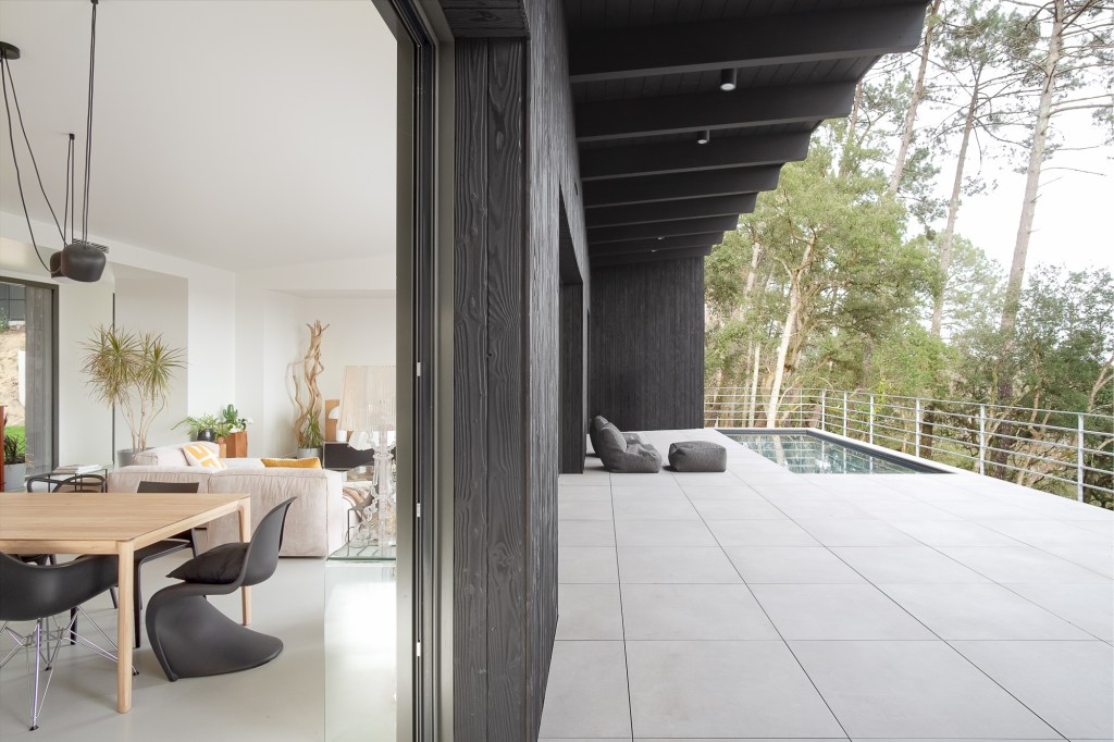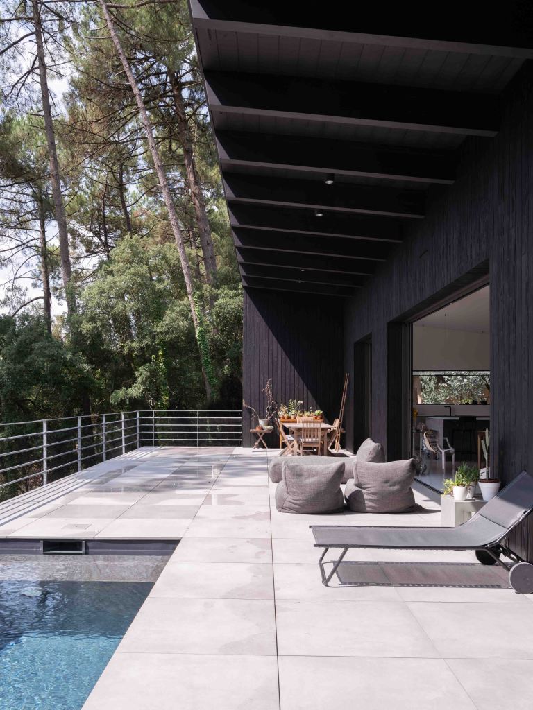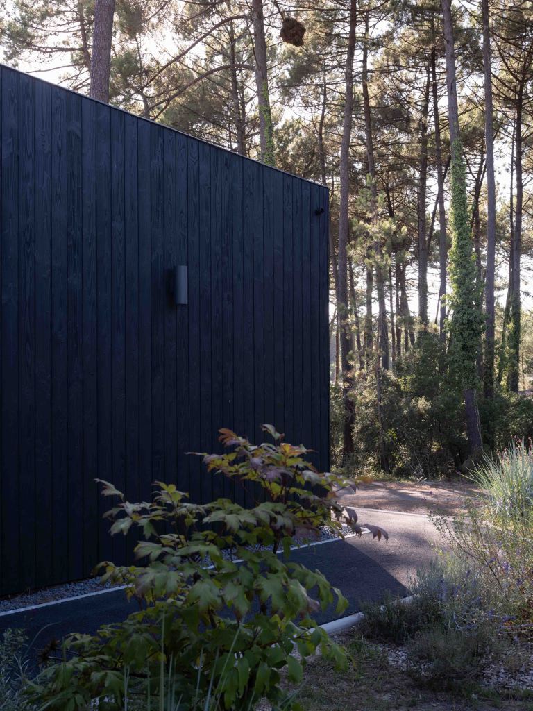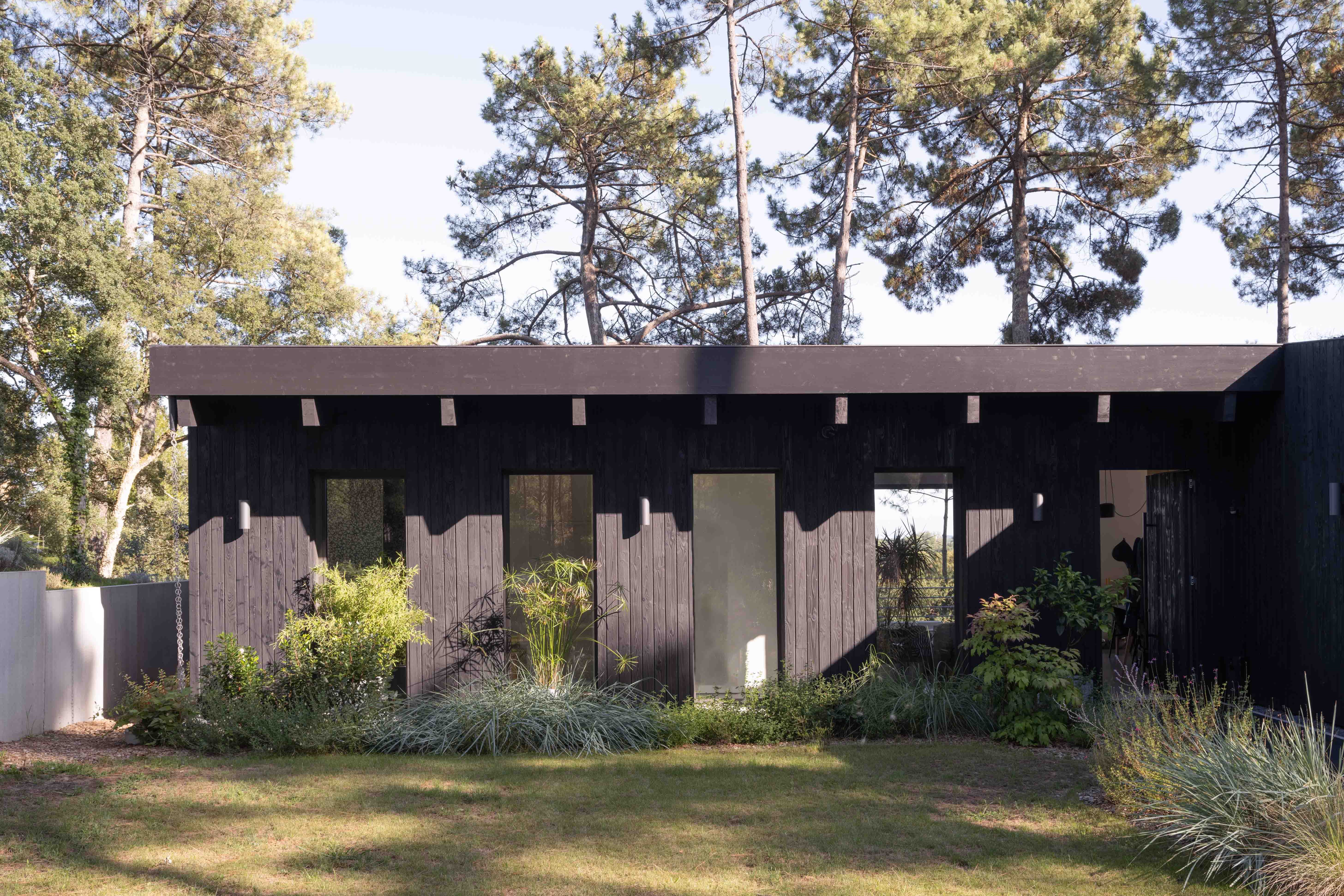 Côté matériaux, le choix du bois brûlé en façade s’inscrit dans une démarche à la fois esthétique et environnementale. Ce revêtement sombre, inspiré de la technique japonaise du shou sugi ban, permet à la maison de se fondre dans la végétation tout en assurant une protection durable contre les intempéries.