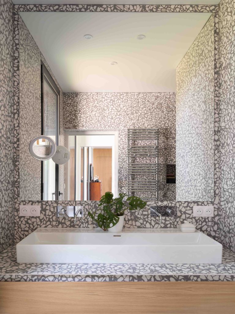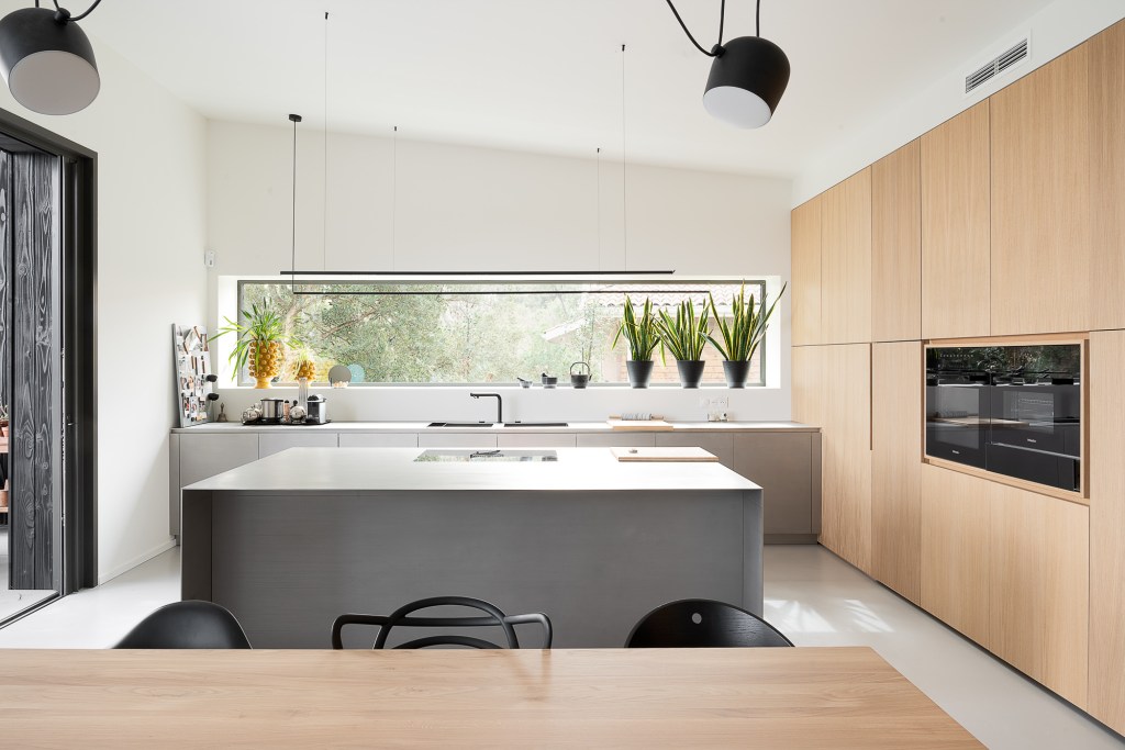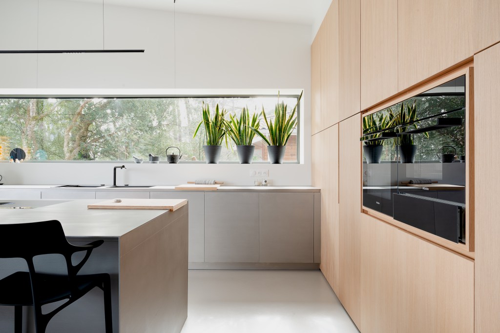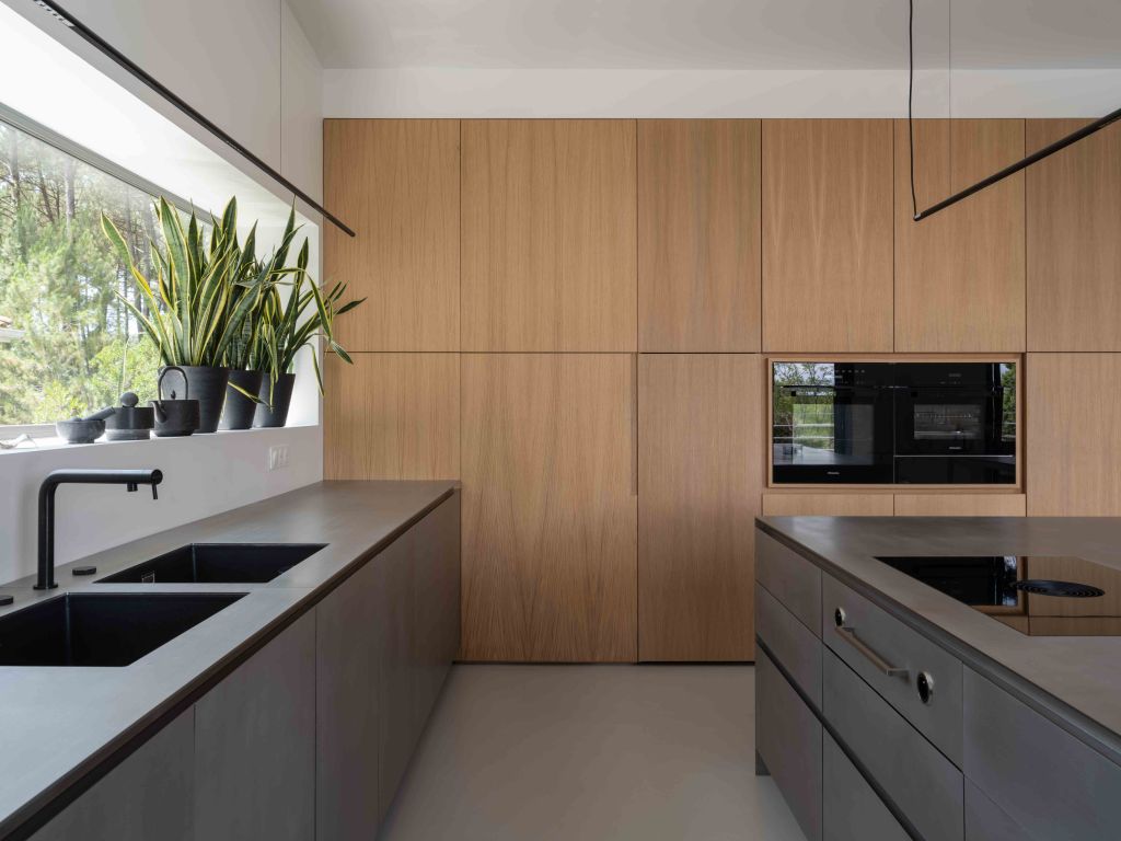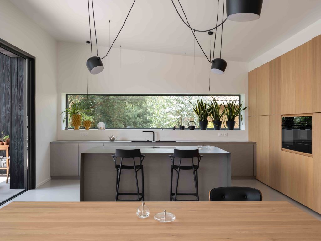 Côté matériaux, le choix du bois brûlé en façade s’inscrit dans une démarche à la fois esthétique et environnementale. Ce revêtement sombre, inspiré de la technique japonaise du shou sugi ban, permet à la maison de se fondre dans la végétation tout en assurant une protection durable contre les intempéries.