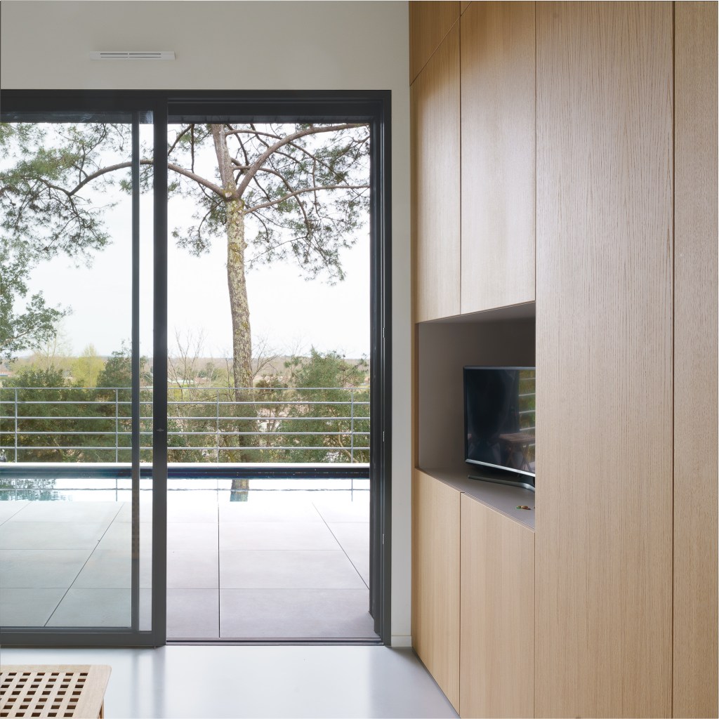 L’un des enjeux majeurs du projet : valoriser la vue sur les Pyrénées. Depuis les espaces de vie, de larges baies vitrées s’ouvrent sur le paysage, prolongeant l’intérieur par une terrasse conçue comme une continuité naturelle. Une fois les baies ouvertes, la frontière entre dedans et dehors disparaît : la maison respire avec son environnement.