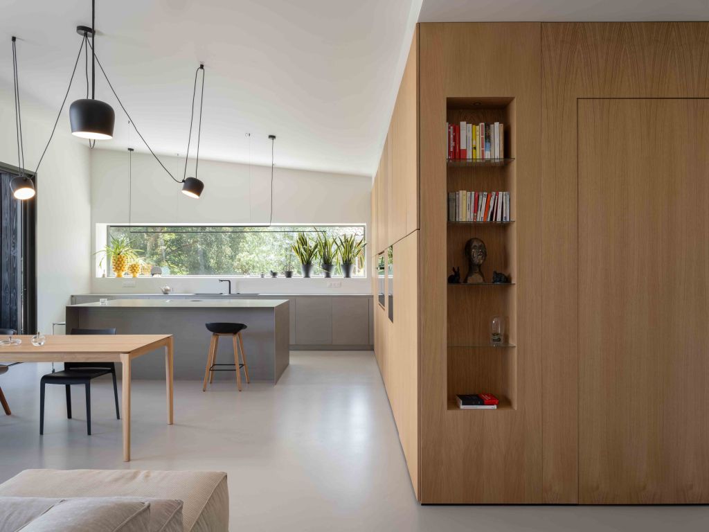 Dès l’entrée, la maison donne l’illusion d’un plain-pied. En réalité, elle épouse finement la pente du terrain, avec un rez-de-jardin qui s’adosse à la déclivité et un étage supérieur qui s’aligne naturellement avec la rue. Ce jeu d’implantation limite l’impact visuel du bâtiment et favorise son intégration dans le terrain boisé.